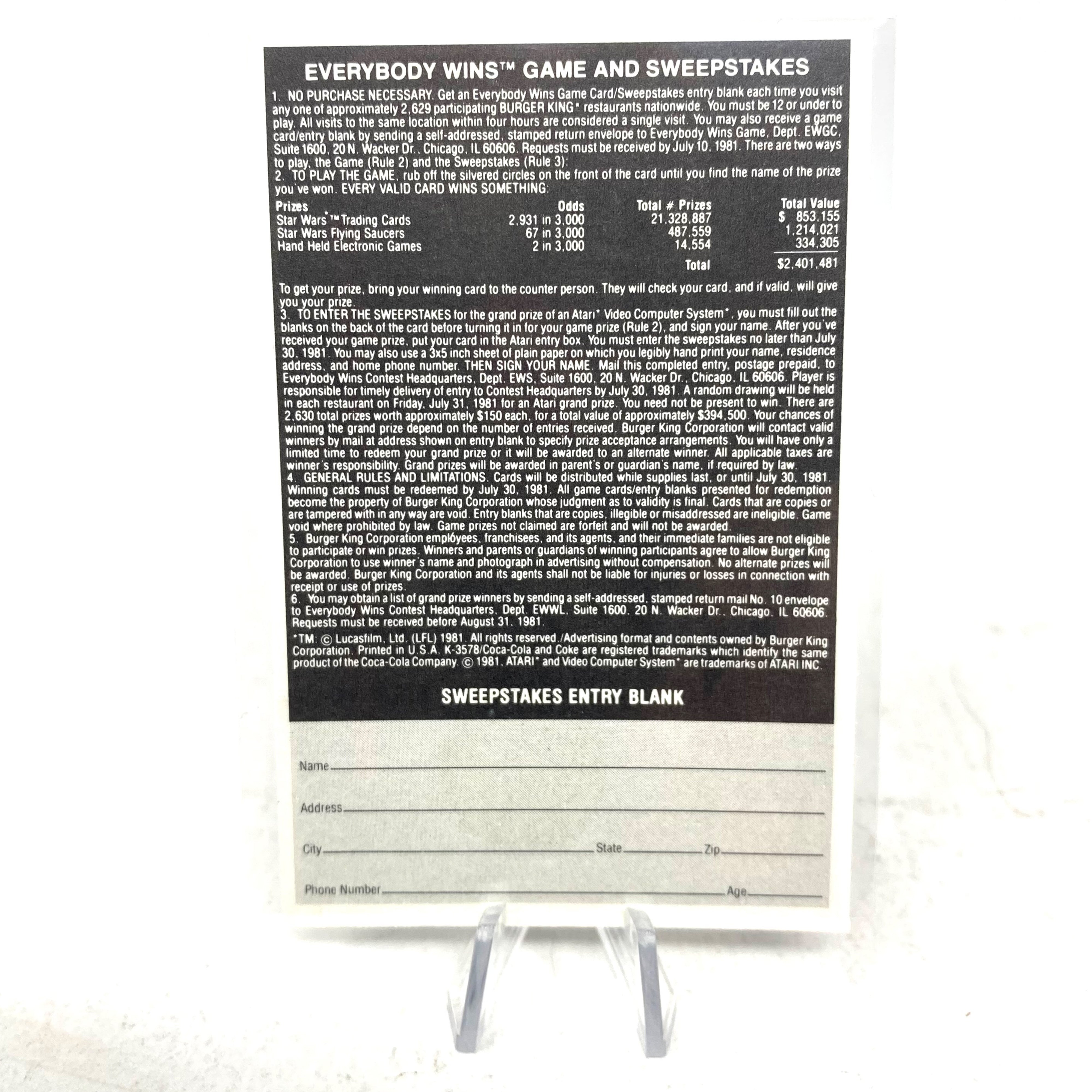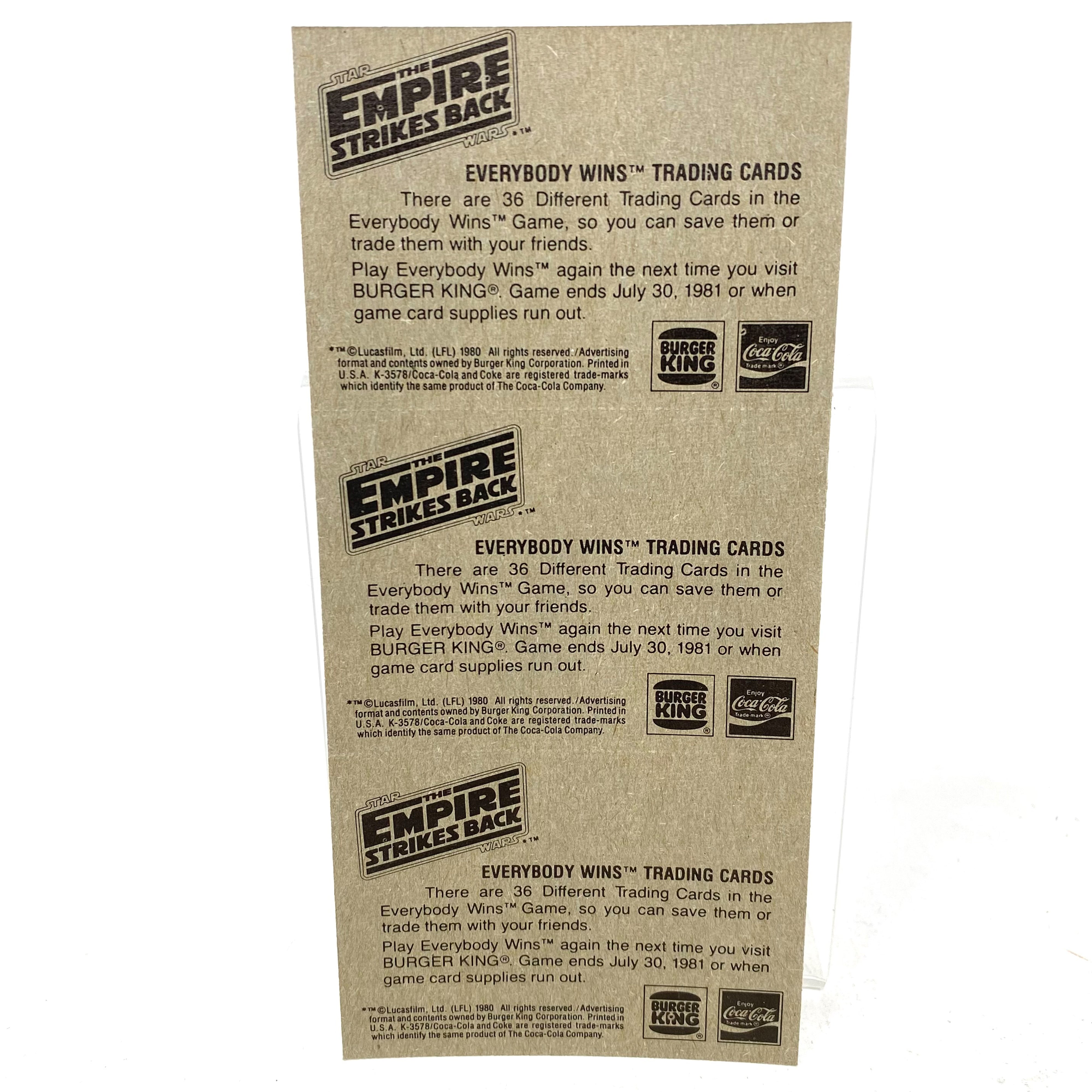 1980 Burger King, Coca-Cola, Star Wars 36 Trading Card Set plus unused Scratch Off