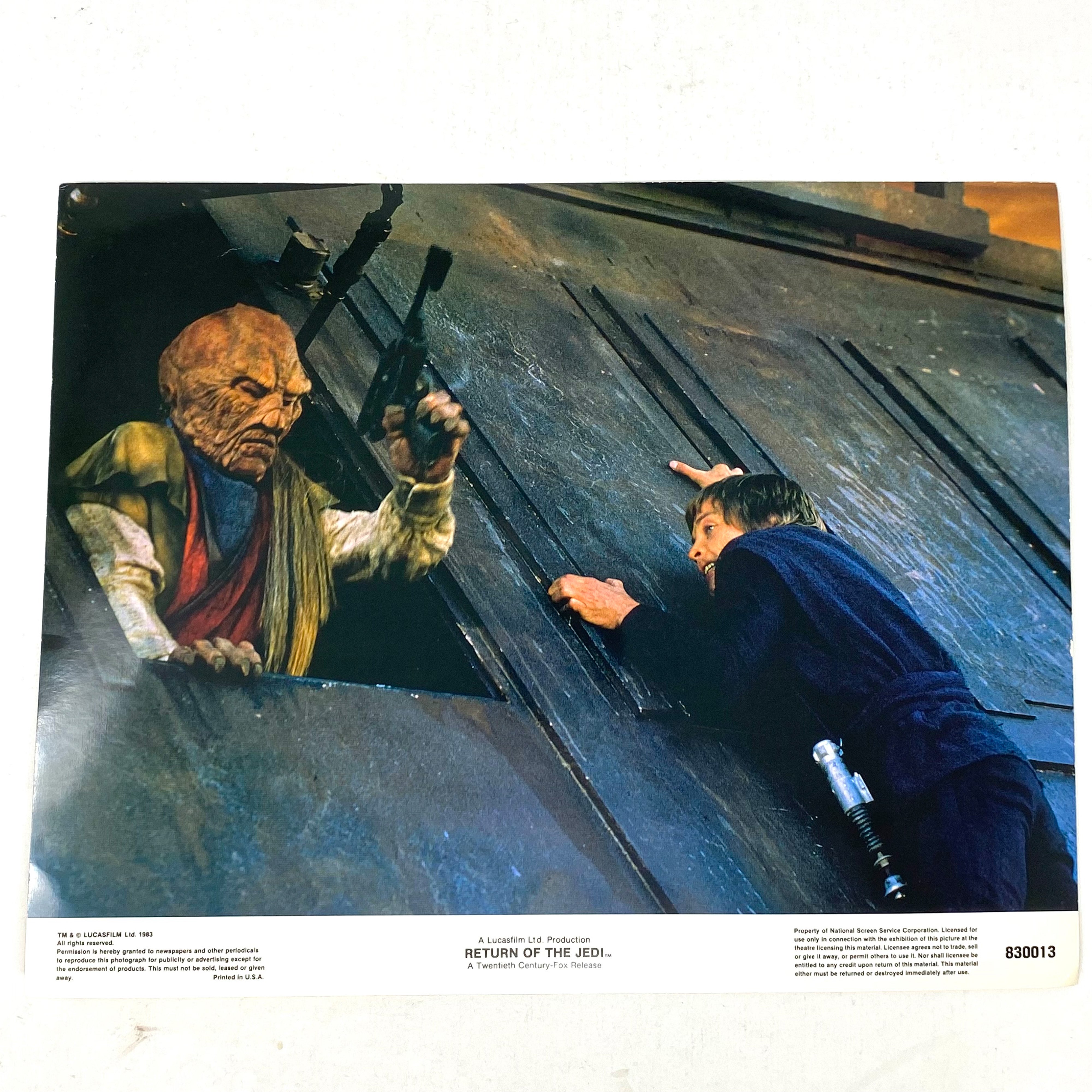 Original 1983 Return of the Jedi Lobby Card featuring Luke Skywalker Jedi Knight and one of Jabba's henchmen on the Sail Barge. Originally came in a set of 8 that measured 11 inches by 14 inches.